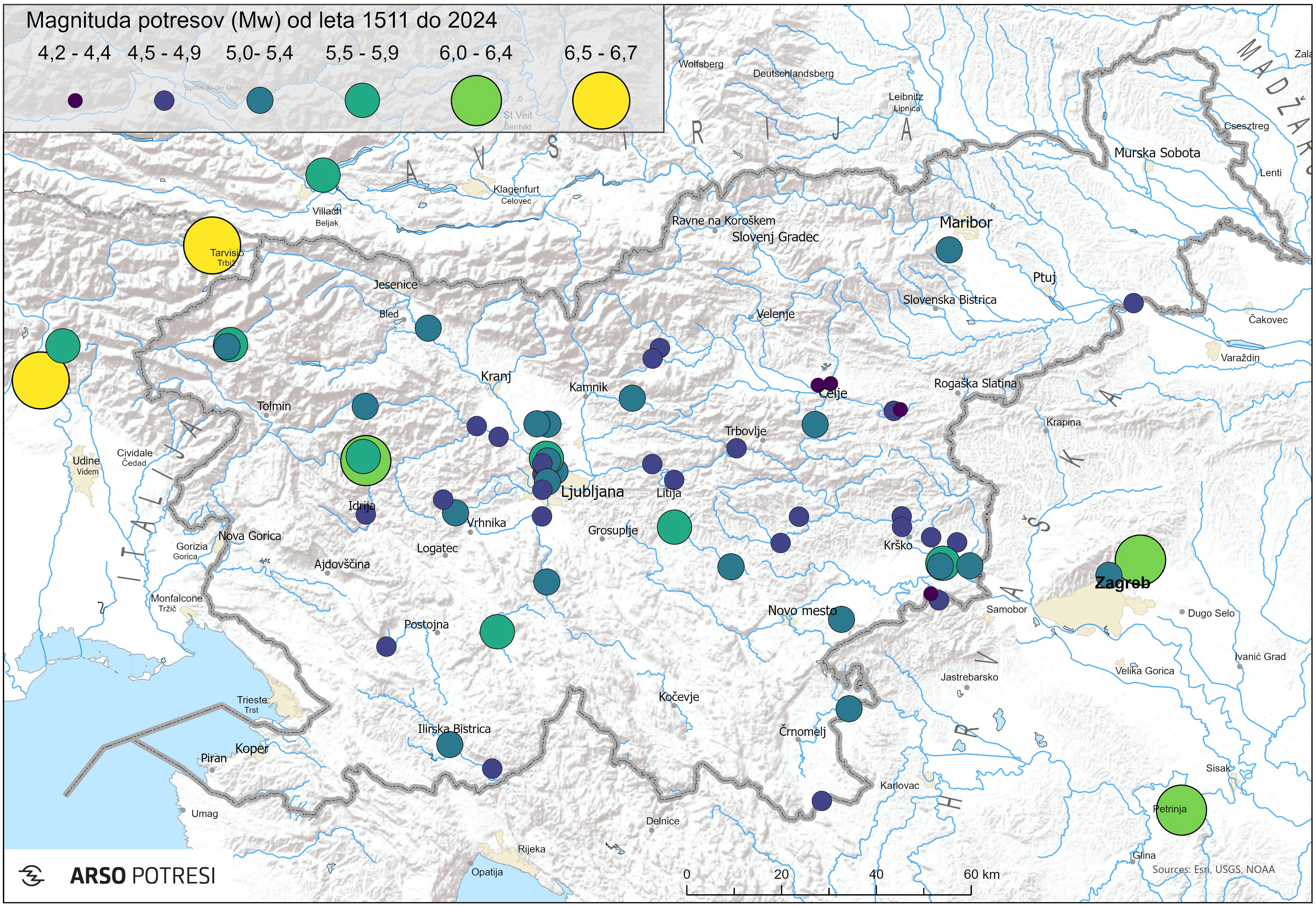 Zemljevid močnih potresov v Sloveniji in bližnji okolici (magnituda potresa)